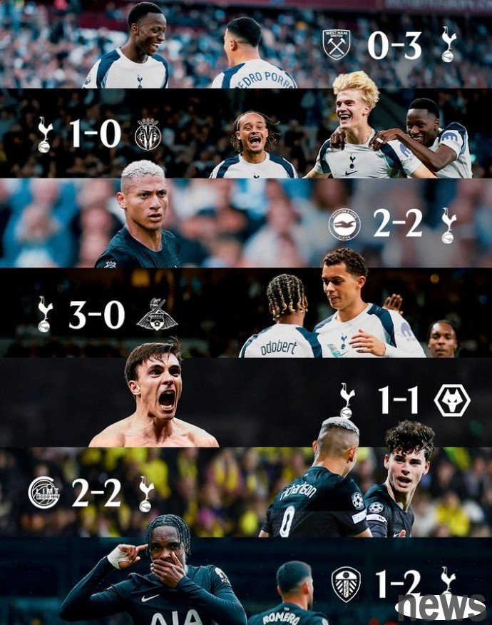 After the game, Tottenham officially revealed the team's recent record: 3-0 West Ham, 1-0 Villarreal, 2-2 Brighton, 3-0 Doncaster Wandering, 1-1 Wolves, 2-2 Bode Shining, 2-1 Leeds United.