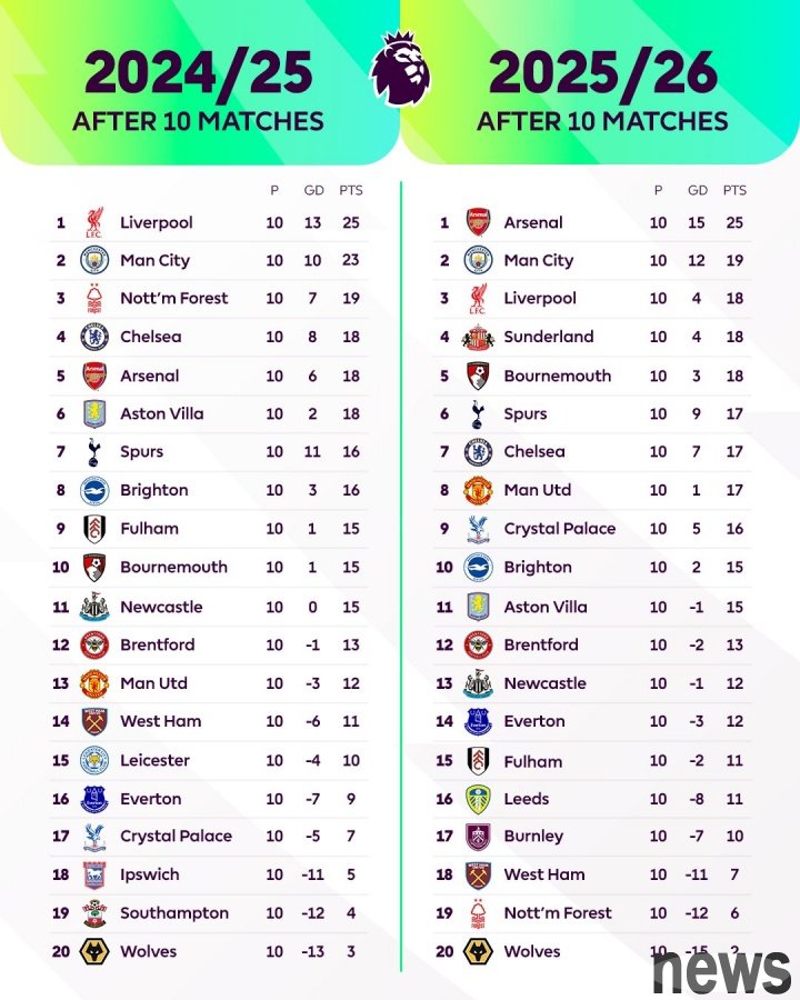 Last season, the leader after 10 rounds was Liverpool with 25 points. This season, at the same stage, Arsenal is the leader with 25 points.