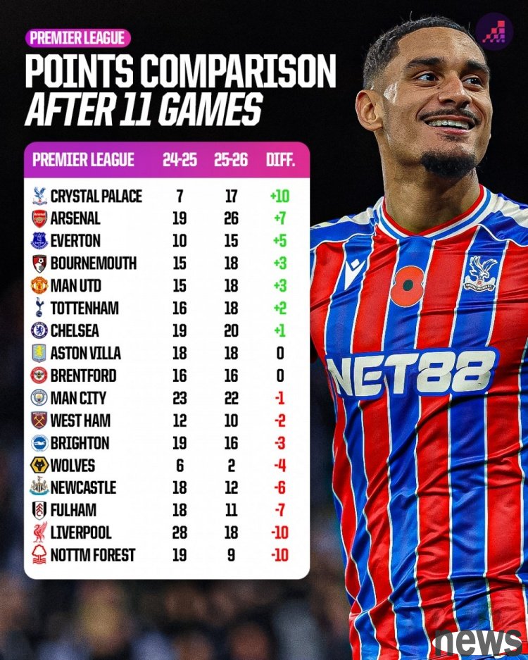 Opta counted the changes in points of Premier League teams in the first 11 rounds of this season and the same period last season, and listed the list. Crystal Palace +10 points improved the most, Arsenal +7 points, and Liverpool -10 points.