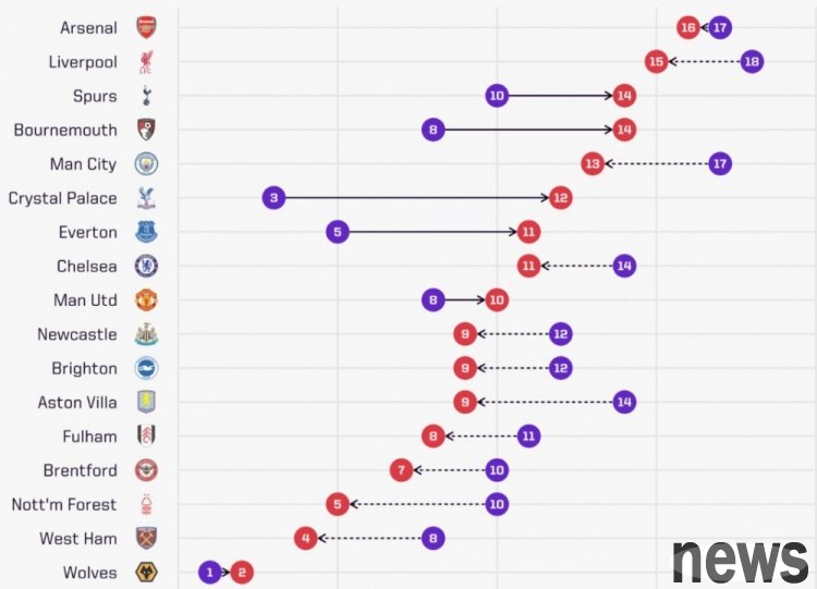 Attached are the scores of the Premier League teams compared to the same period last season: