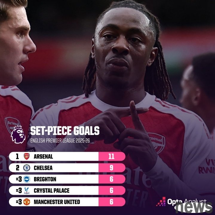 According to opta statistics, Arsenal has scored 11 goals through set pieces this season, ranking first in the Premier League.