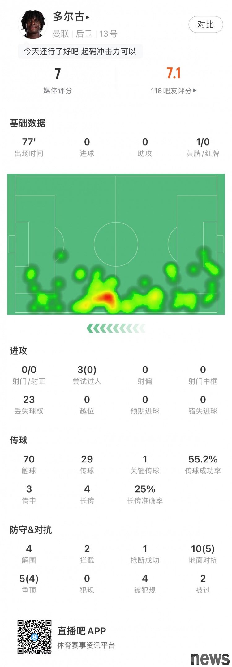 In terms of other statistics, Dorgu's passing success rate is only 55.2%, and his long pass accuracy is only 25%. In addition, he has lost the ball as many as 23 times. However, although Dorgu did not succeed in dribbling in this game, his two dribbling attempts resulted in yellow fouls by his opponents.