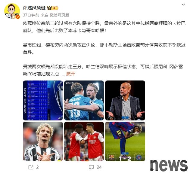The second round of the Champions League matches were all over, Paris defeated Barcelona 2-1, Manchester City 2-2 Monaco, Arsenal 2-0 Olympiacos, Napoli 2-1 Portuguese Sports, and Juventus 2-2 Huang Qian. Post-match commentator Zhan Jun posted a message.